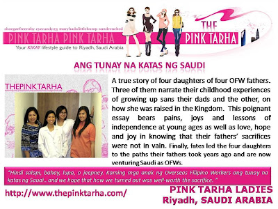 There was a primary reason why we first blogged - to break the confines of our boring existence in the desert of Saudi Arabia. To merely say that wala kaming magawa was very apt. But that was before PEBA 2009. The Pinoy OFWs/Expats Blog Awards widened our reach to other people and now, the Pink Tarha has been given a direction. It's not just a diary of kikay whims anymore but a lifestyle guide. Something that helps and inspires others. For this, we are thankful for the PEBA community. To all blogging Filipinos abroad, share your passion by joining the PEBA 2010. It's one experience that will change you. To PEBA 2010, cheers! - The Pink Tarha ladies, 2nd placer