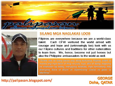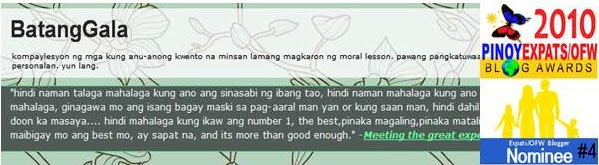 PEBA 2009 was an overwhelming experience, it's the joy of writing beyond blogging, sharing a part of my life through blog inspiring fellow OFWs, an OFW community and the world. To be part of the Top 10 Bloggers of PEBA is a magnanimous feeling as I share my award with my family, friends and fellow OFWs who has become part of my life and of my blog. To all PEBA 2010 aspirants and nominees, PEBA's 2010 event is more than just a contest and it's not just about winning - PEBA's cause is larger than life, an invitation for Pinoy bloggers to be part of the hub of a social media reaching out to the masses, as your life story could touch lives and bring change to an OFW family, to a "Diasporic Pinoy community" and perhaps to the world. - The Pope of Palipasan, 6th placer