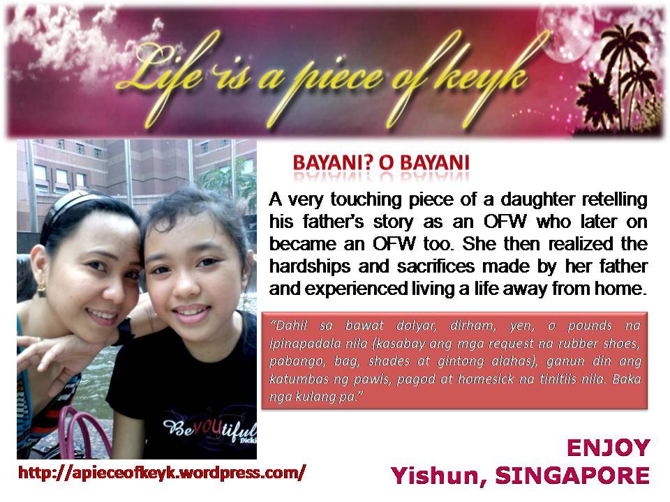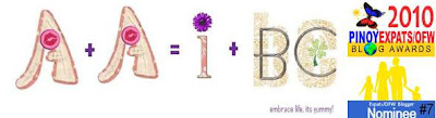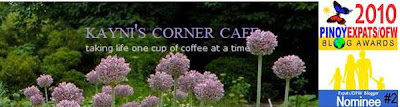 I really appreciate all the people behind the efforts in making PEBA successful each year. I've met people who, do not only eloquently share their life experiences with others, but find ways to make a difference across the globe and being a part of the organization is really an honor. When I became one of the top ten winners in the PEBA 2009, I was happy, surprised... mixed emotions. It was unexpected because I admit that the competition was really tight and all entries were deserving of the title or to be in the top 10. And also because I didn't put much effort in promoting my entry and I only have a few readers (who are also readers of other bloggers who joined the contest), I never expect much. To all the nominees of this year's PEBA, I wish you all the best. It doesn't matter whether you win the title or not, what matters is that you're writing from the heart and you give your best to contribute to achieve your goal to be heard not only by one or two people, but Filipinos around the world. And to PEBA, cheers to another year of selfless commitment to promote, uplift and unite OFW bloggers across the globe! ~ Enjoy of A Piece of Keyk, 5th placer
