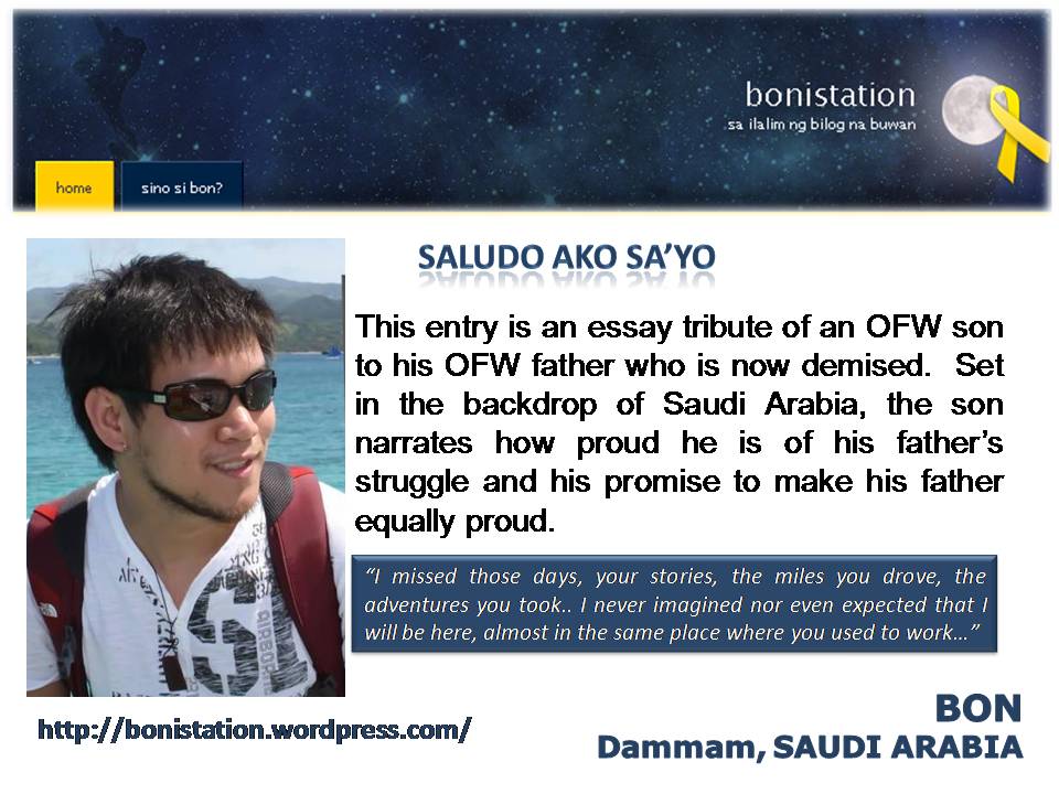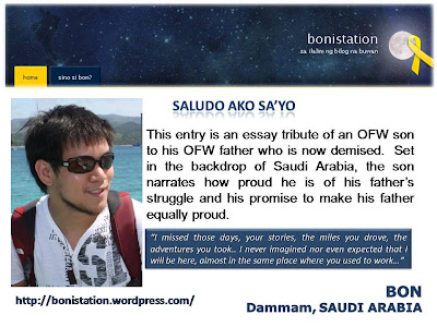 To be part of PEBA 2009 is really a rewarding experience and what makes it extraordinary for me is to be a part of the top 10 winners. The award PEBA gave me somehow boosted Bonistation in the blogosphere. And I owe this to everyone who appreciated my blog particularly my winning entry, “SALUDO AKO SAYO”. Of course this honors my DAD, a tribute for his name, for my name. And for PEBA 2010 nominees, consider that you are all winners. Rock the world with your stories, stories that will capture the heart of everyone in the Blogosphere and in the whole world as well. Good luck to all nominees! More power to PEBA! ~ Bon Talampas of Boni Station, 8th placer
