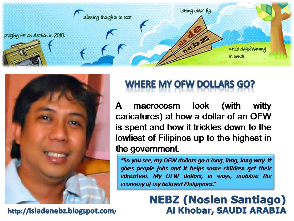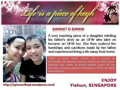 When I wrote my article for PEBA 2009, winning was the last thing on my mind. All I really wanted was to share my thoughts on the theme. More than the award, the best that I got out of PEBA 2009 is being able to interact and work with some of the finest OFW bloggers. You can, too! Join PEBA 2010! Oh, yes. I have three winning tips for you: Write from your heart. Make them cry. And finally, kiss it if you can (I mean, keep it short and succulent, or suave and saucy, or simple and sweet). Good luck! - Isladenebz, 1st placer